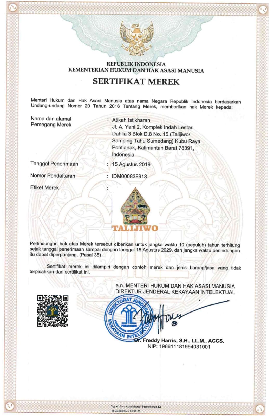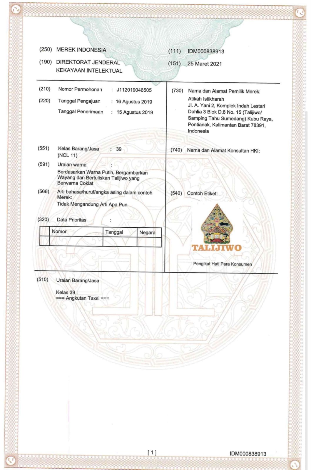 Taxi Talijiwo telah memperoleh sertifikat resmi merek dan legalitas operasional